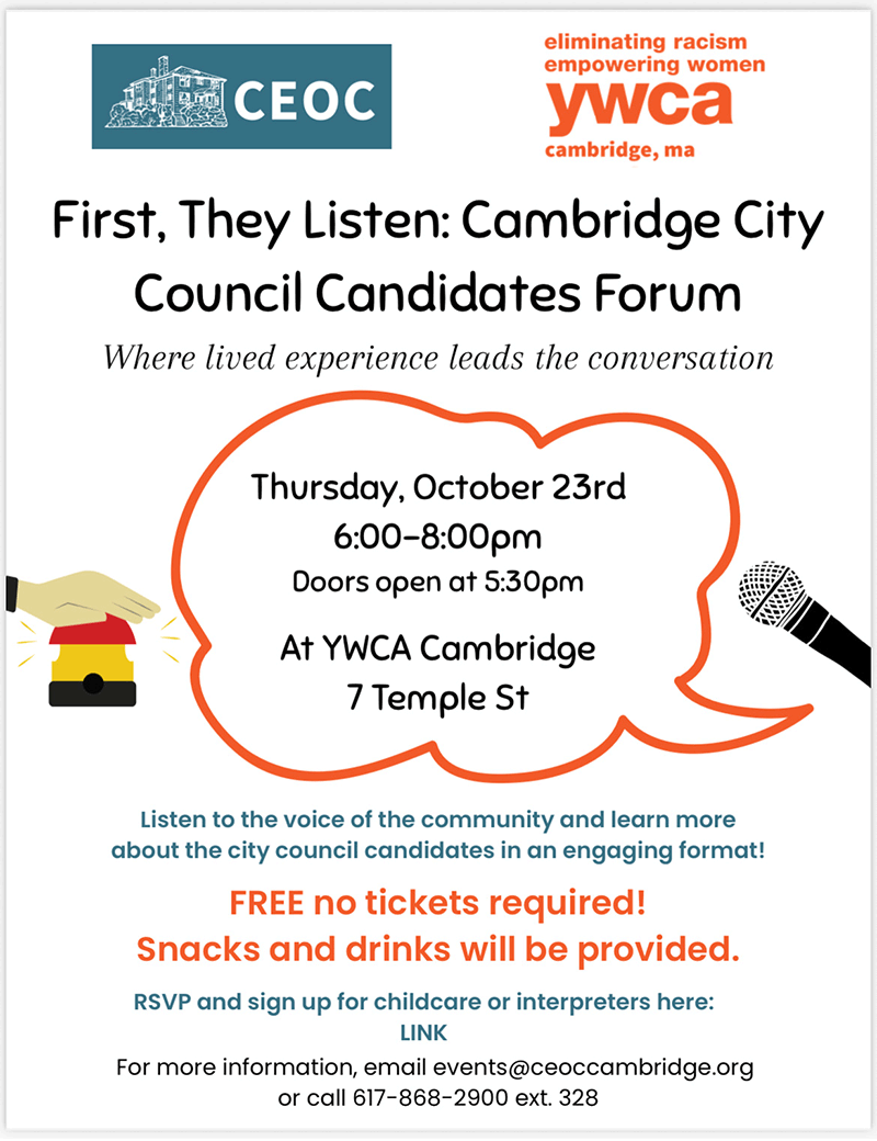 8 | 9 | 10 City Council Candidates Forum (6:00pm-8:00pm) hosted by A Better Cambridge (ABC) - Central Sq. Senior Center [register here] School Committee Candidate Forum hosted by the Cambridge Education Association (CEA, teachers union); 6:00pm-8:00pm (Cambridge Main Library) [flyer] |